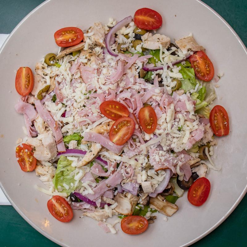 Green bell peppers, purple onions, black olives, green olives, mushrooms, mozzarella cheese, ham, grilled chicken breast with your choice of dressing.
