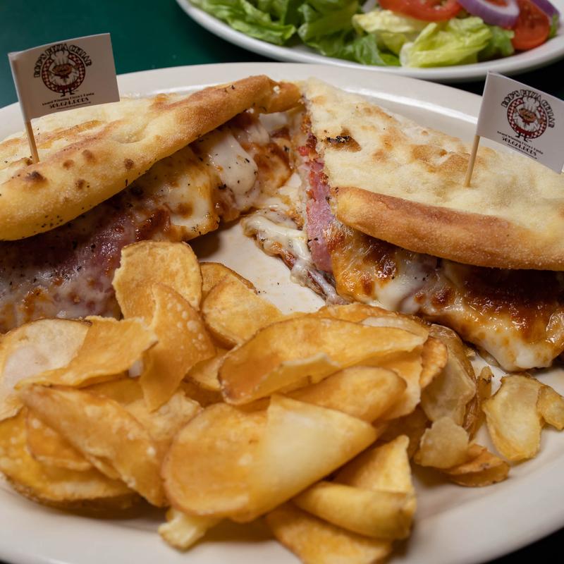 Grilled, baked with ham, salami, pepperoni and provolone cheese with lettuce, tomatoes, pickle and purple onion and served on crispy pinsa bread.
