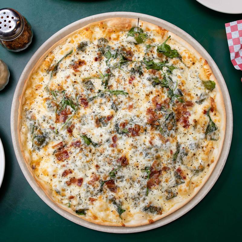 Alfredo sauce, roasted garlic, spinach, bacon with mozzarella and provolone.